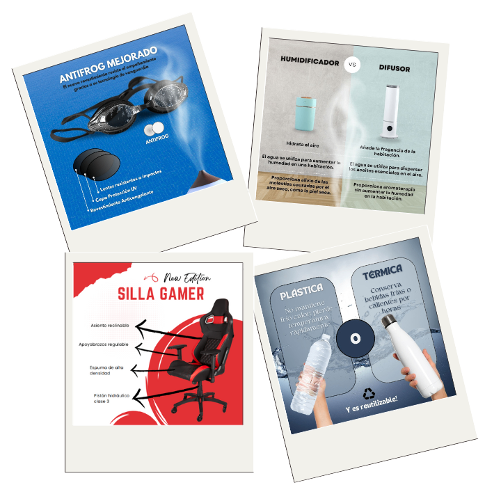 - Cómo realizar las más eficientes infografías y videos de productos para mostrar características, beneficios y funcionalidades del producto.